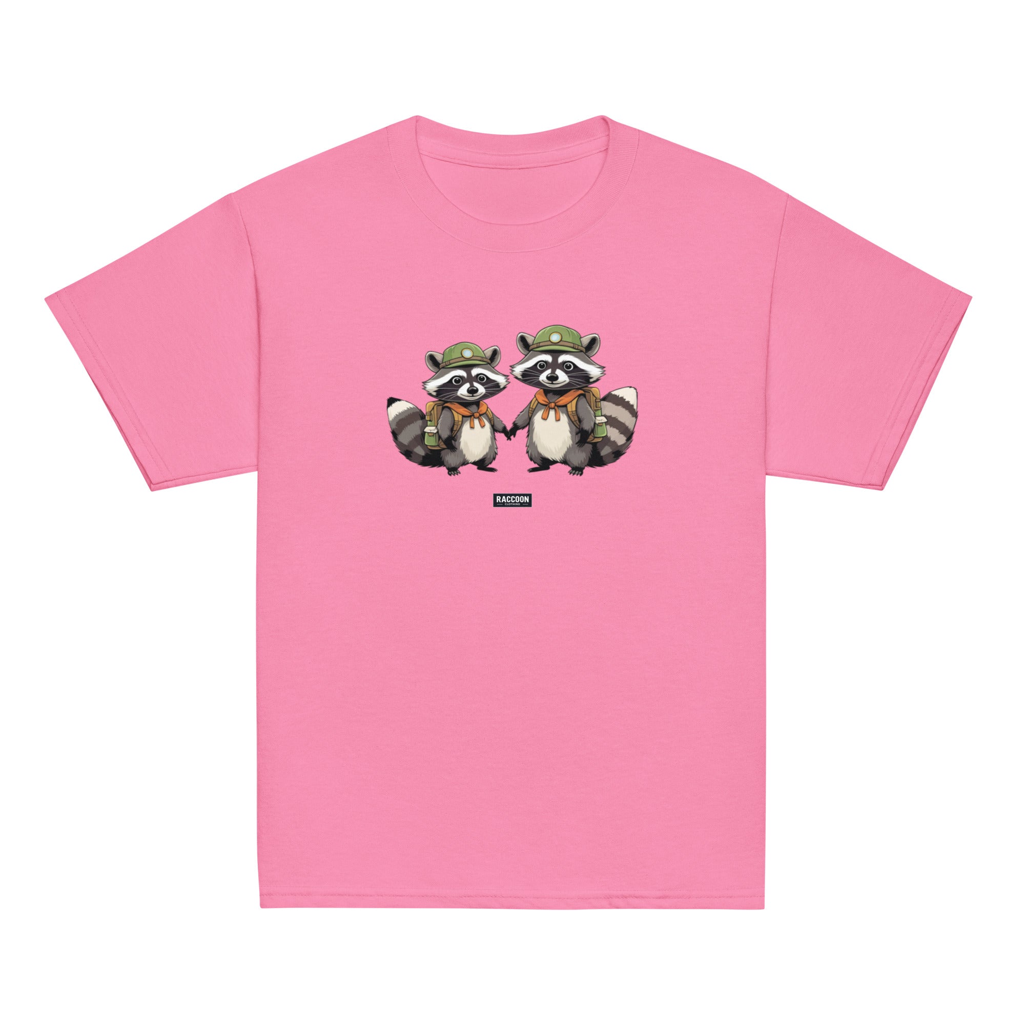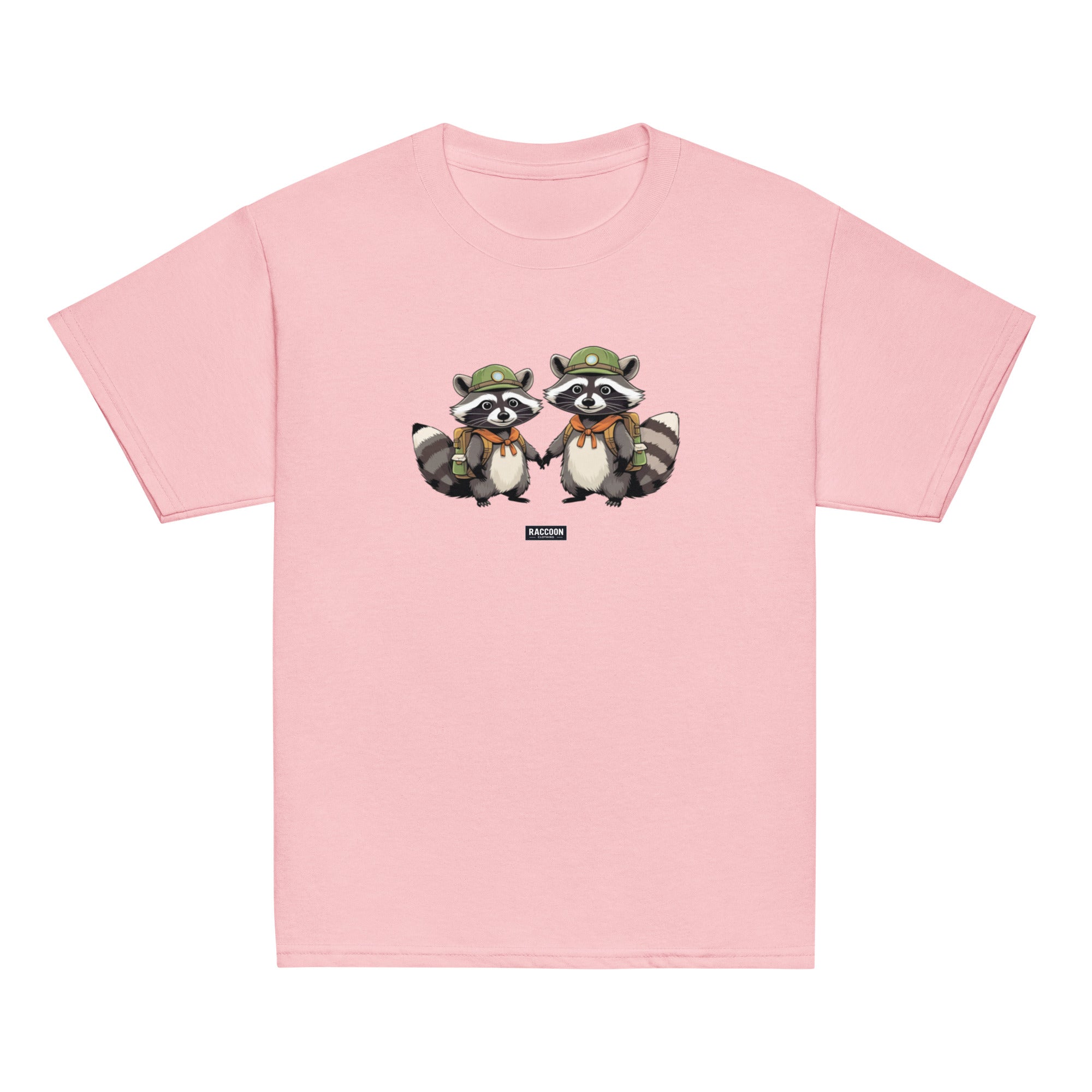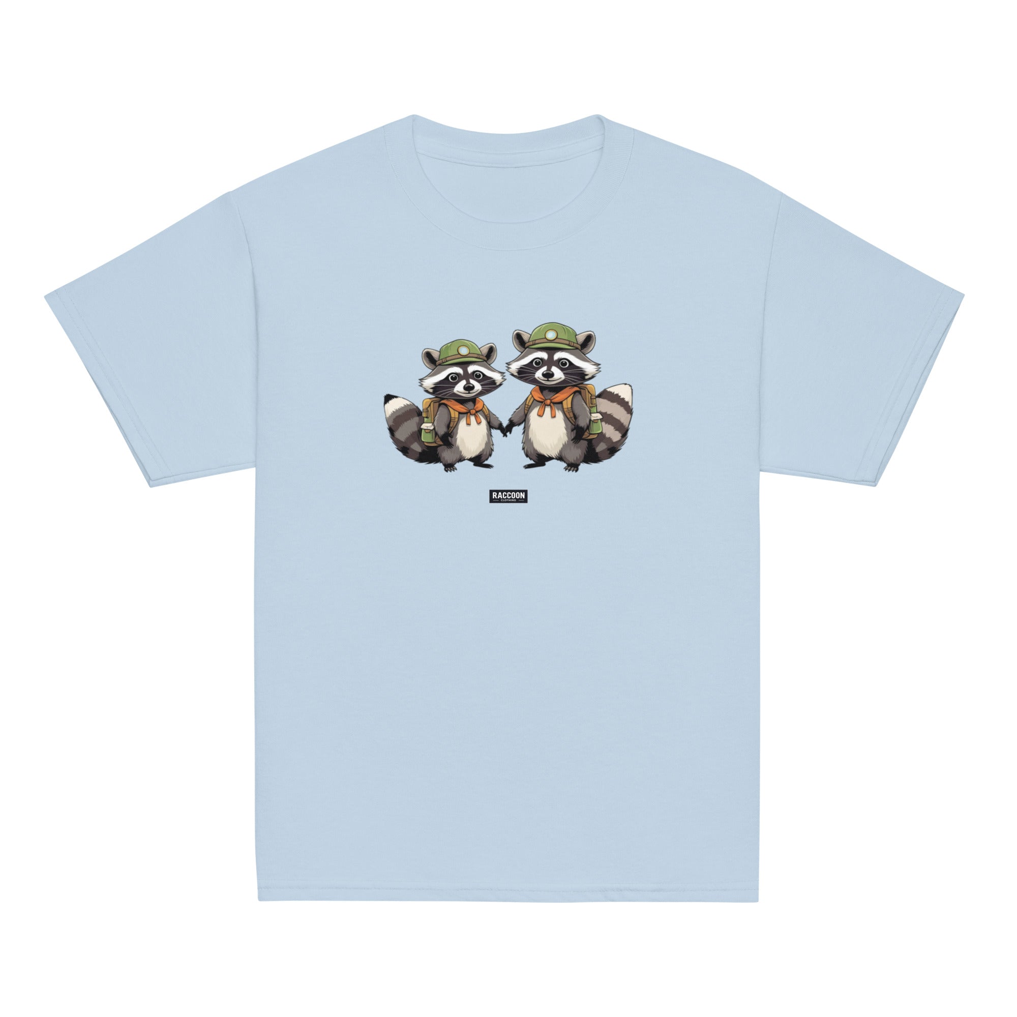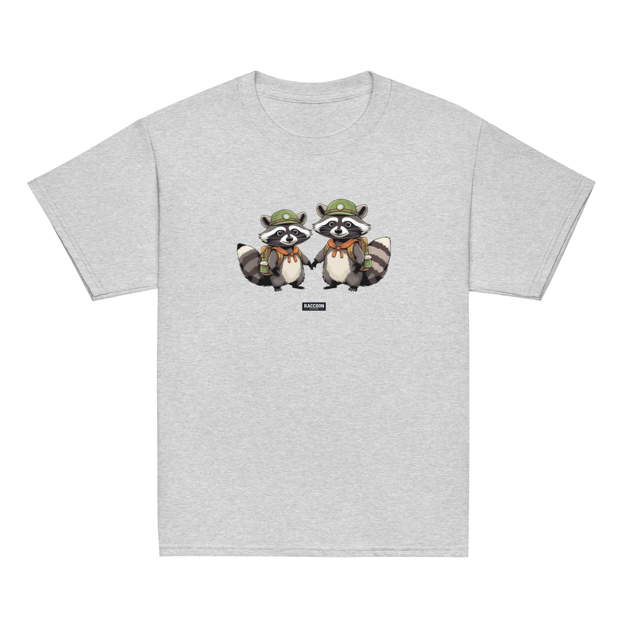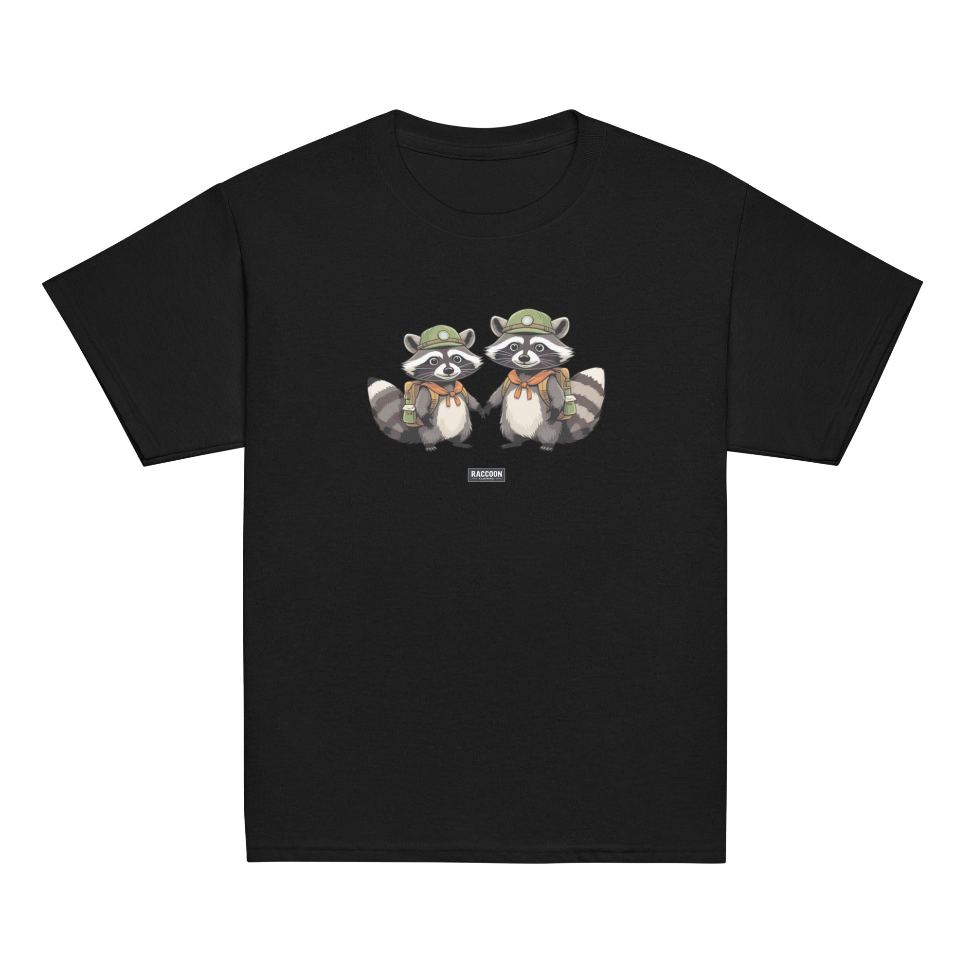 Embark on your next adventure with these charming Scout Raccoon Buddies! This playful tee features two hand-drawn raccoons in explorer...