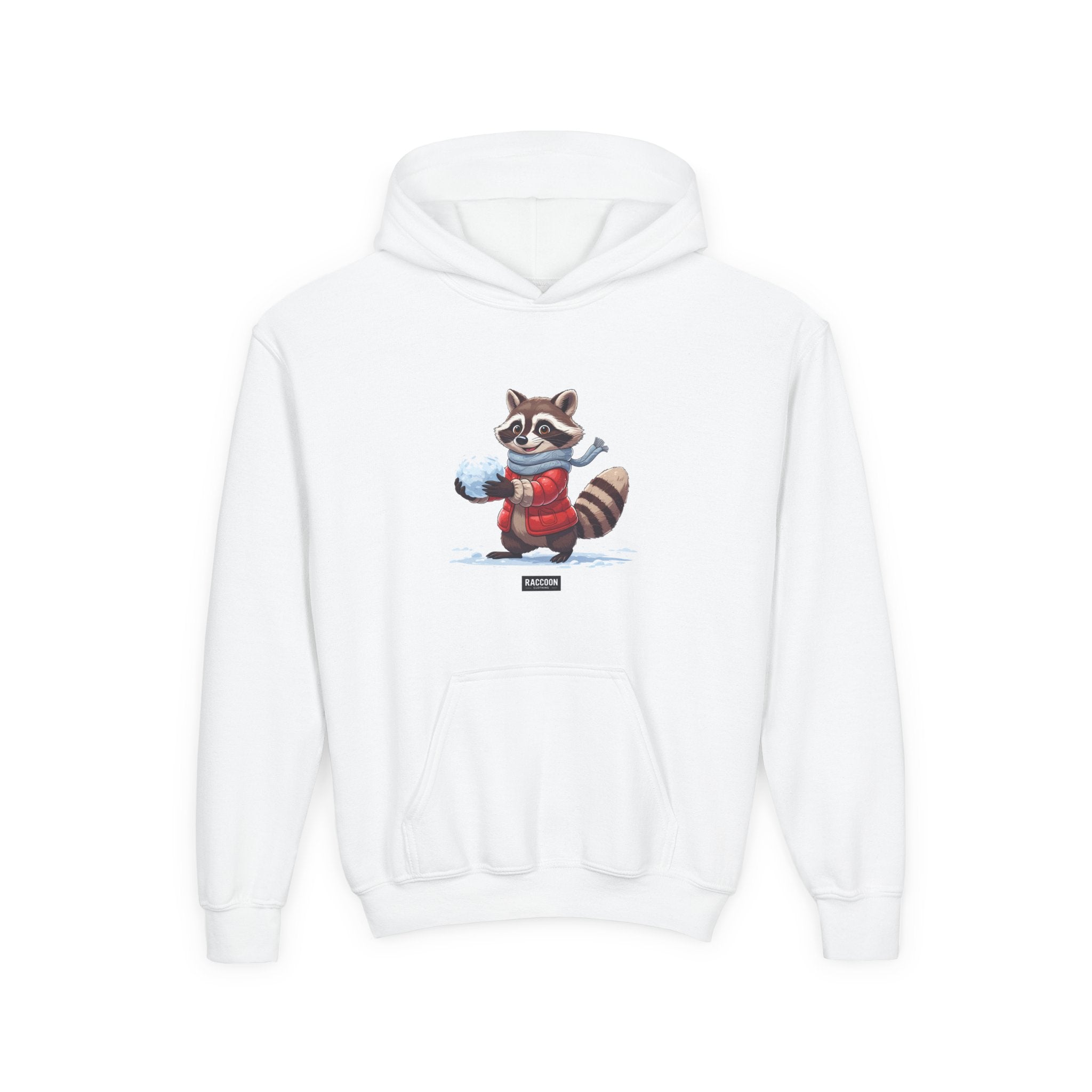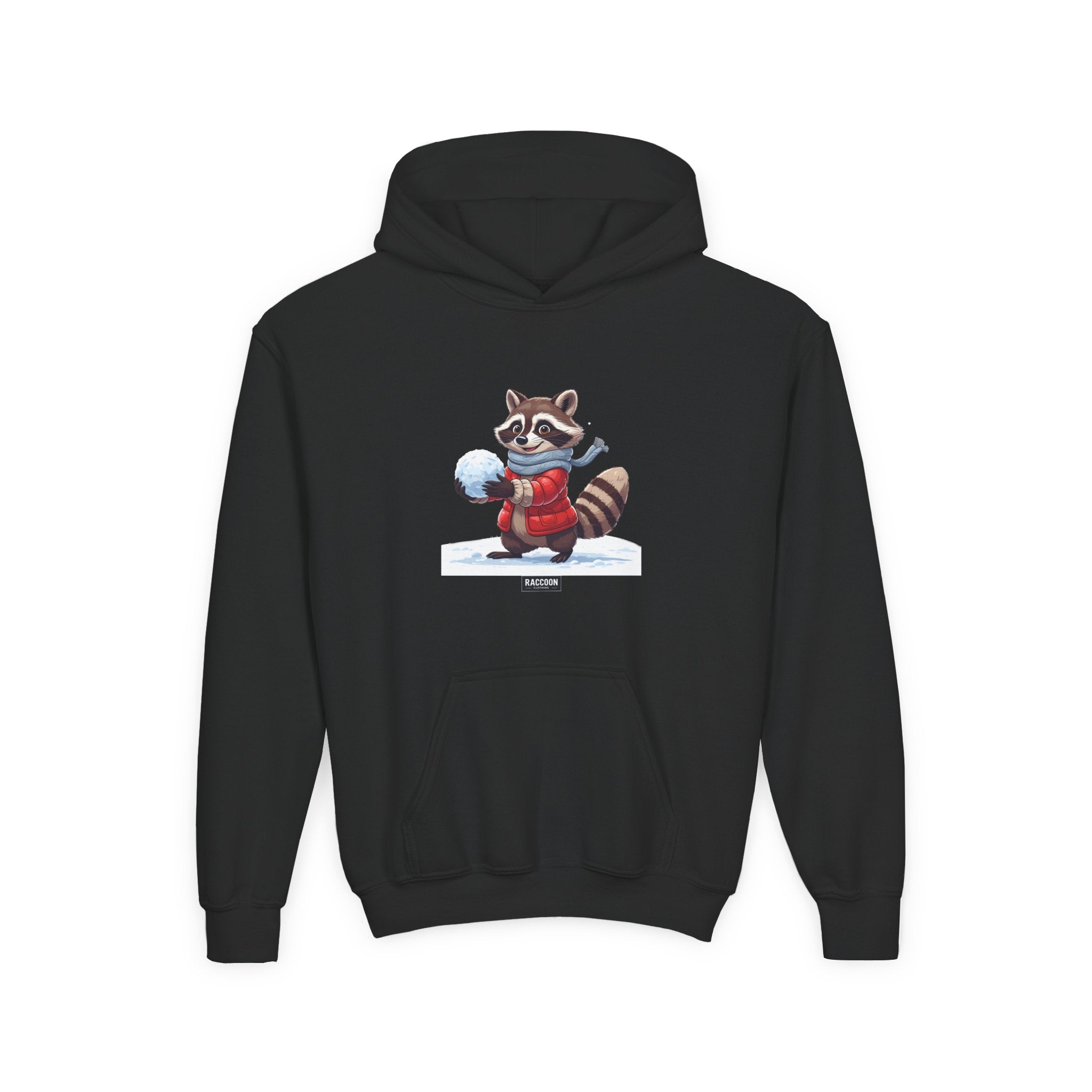 Get ready for frosty fun with this playful raccoon bundled up in a puffy red jacket and scarf, holding a...