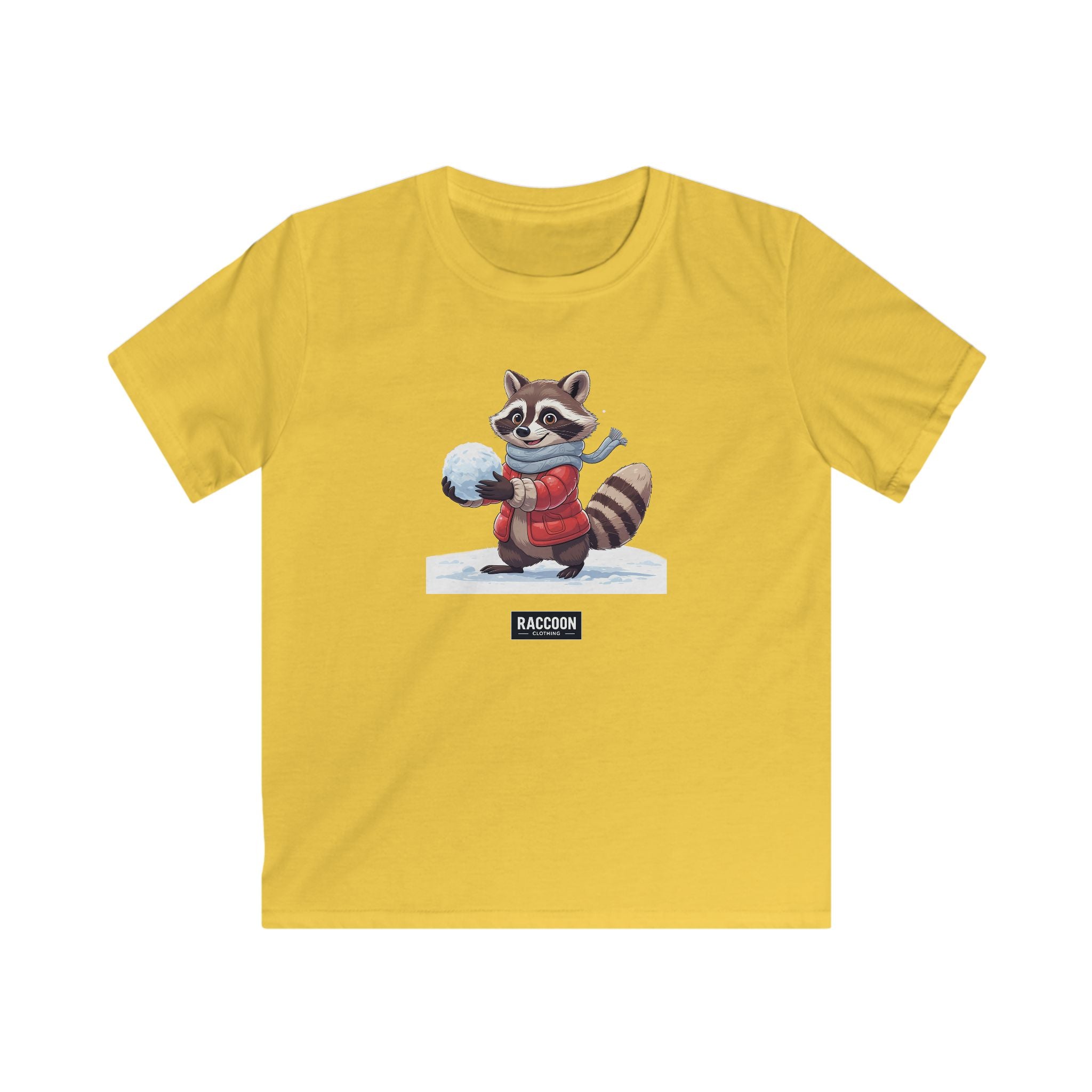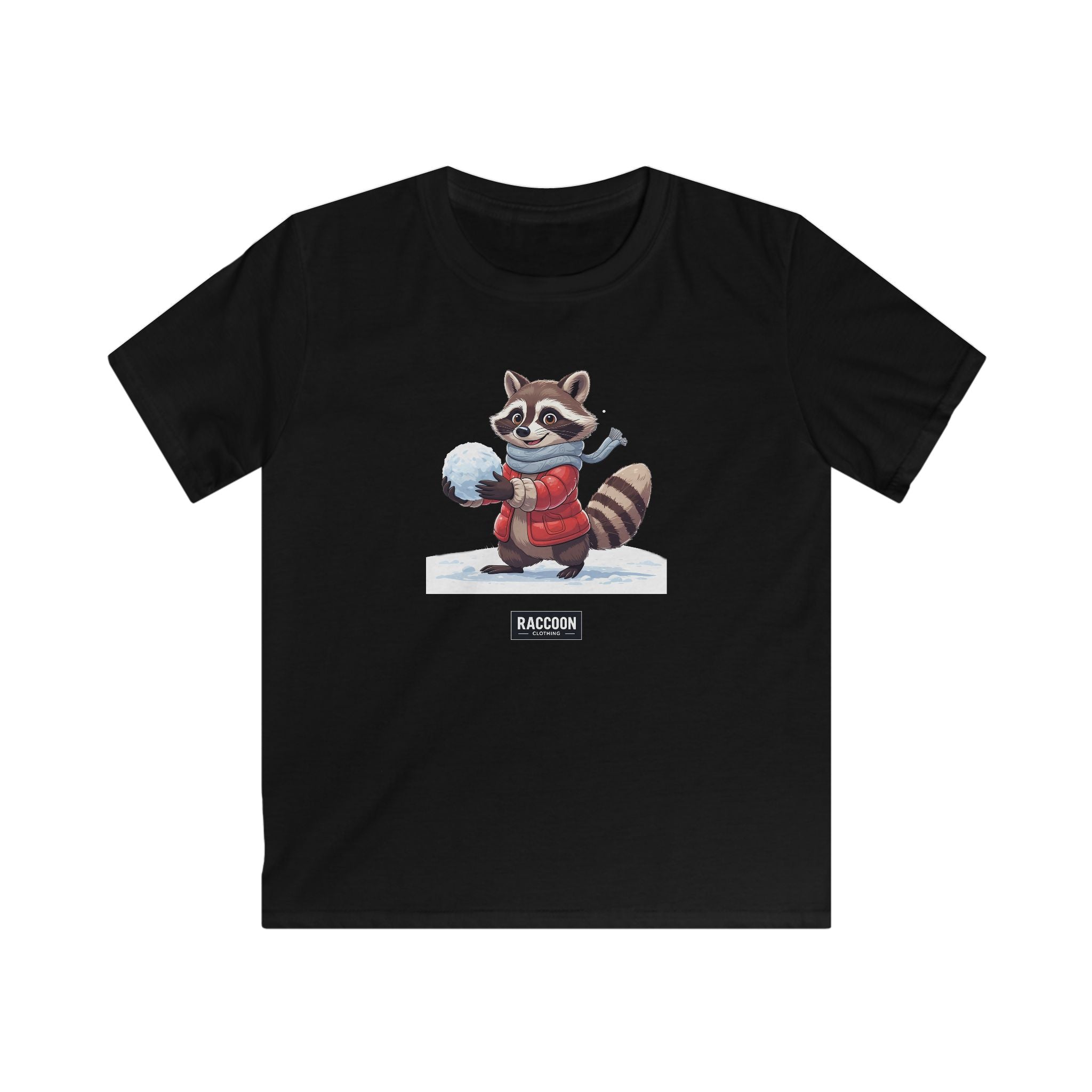 This adorable raccoon, dressed in a cozy red jacket and scarf, is ready for winter fun with a snowball in...